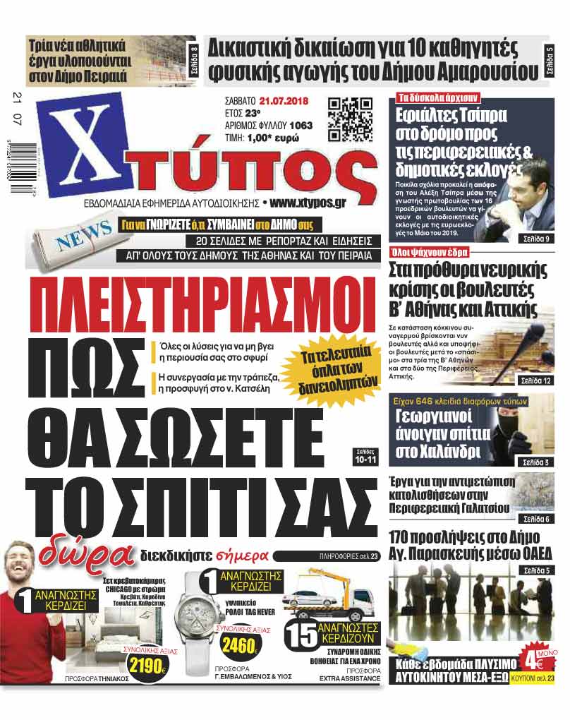Πρωτοσέλιδο «ΧΤΥΠΟΣ» Σαββάτου 21 Ιουλίου 2018