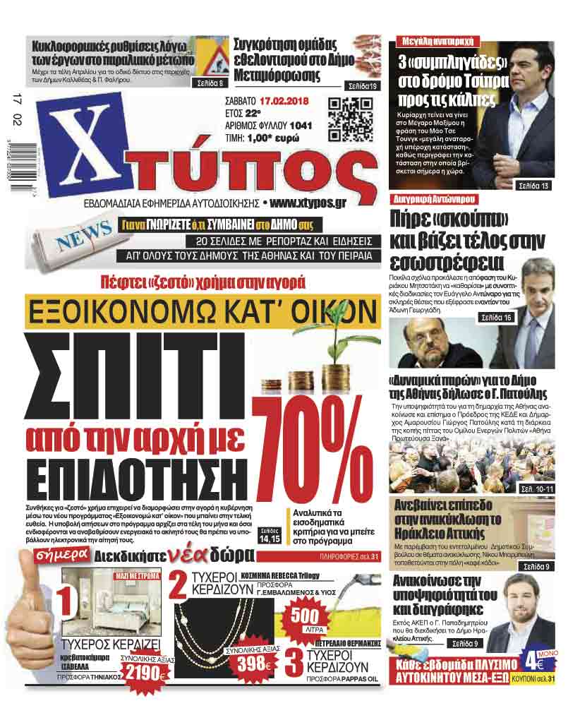 Πρωτοσέλιδο «ΧΤΥΠΟΣ» Σαββάτου 17 Φεβρουαρίου 2018