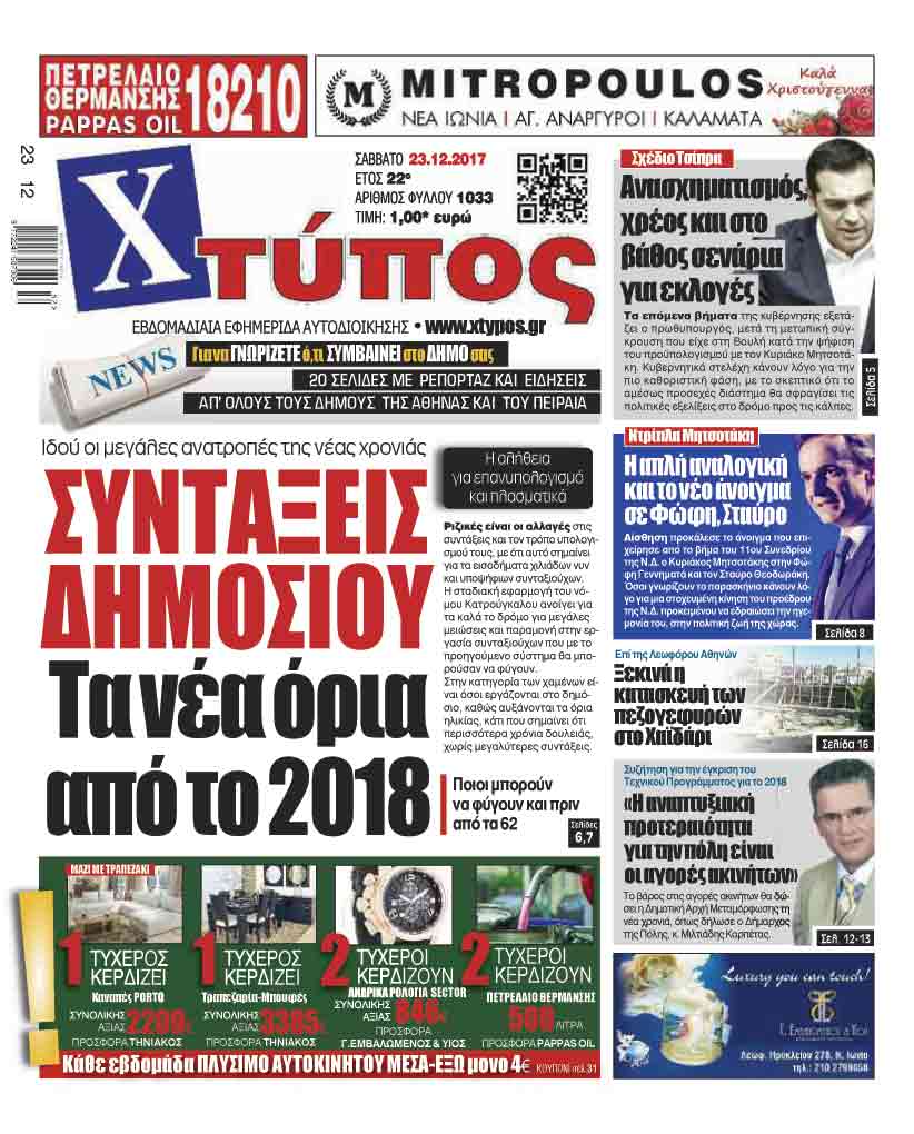 Πρωτοσέλιδο «ΧΤΥΠΟΣ» Σαββάτου 23 Δεκεμβρίου 2017