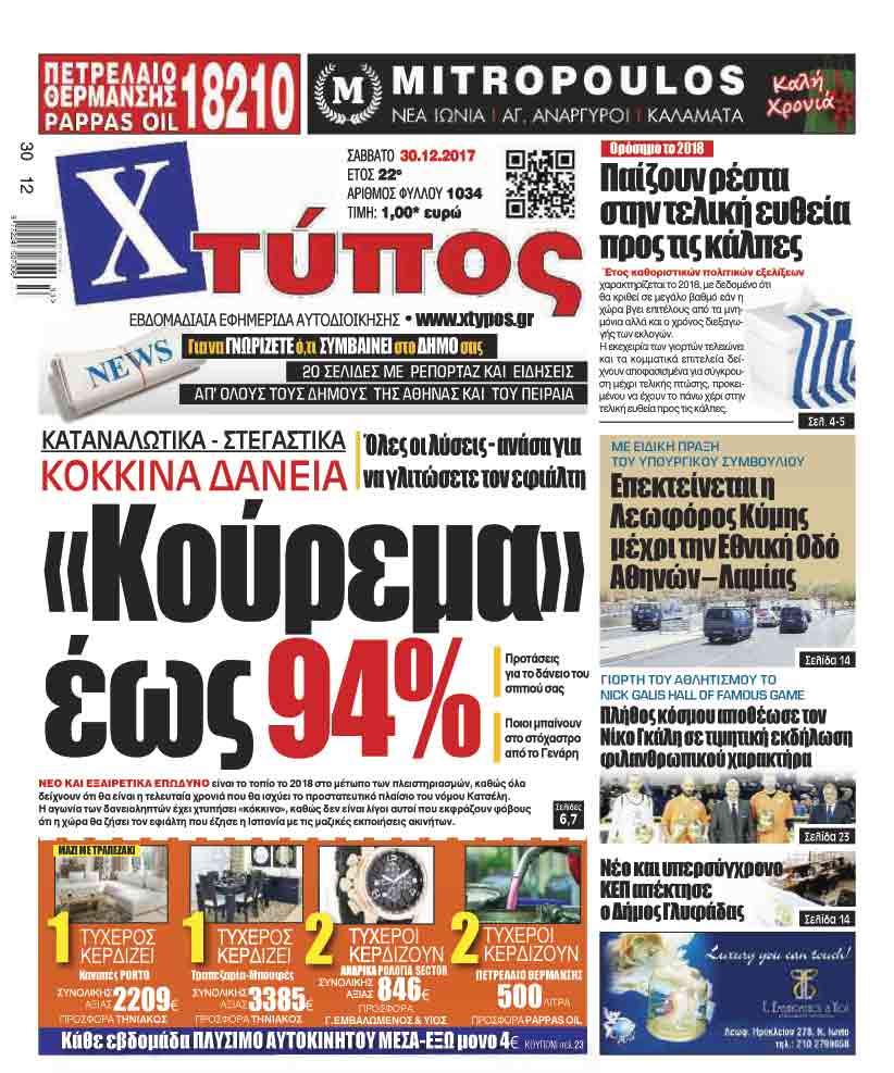 Πρωτοσέλιδο «ΧΤΥΠΟΣ» Σαββάτου 30 Δεκεμβρίου 2017