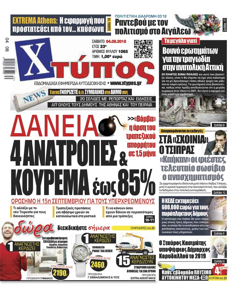 Πρωτοσέλιδο «ΧΤΥΠΟΣ» Σαββάτου 4 Αυγούστου 2018