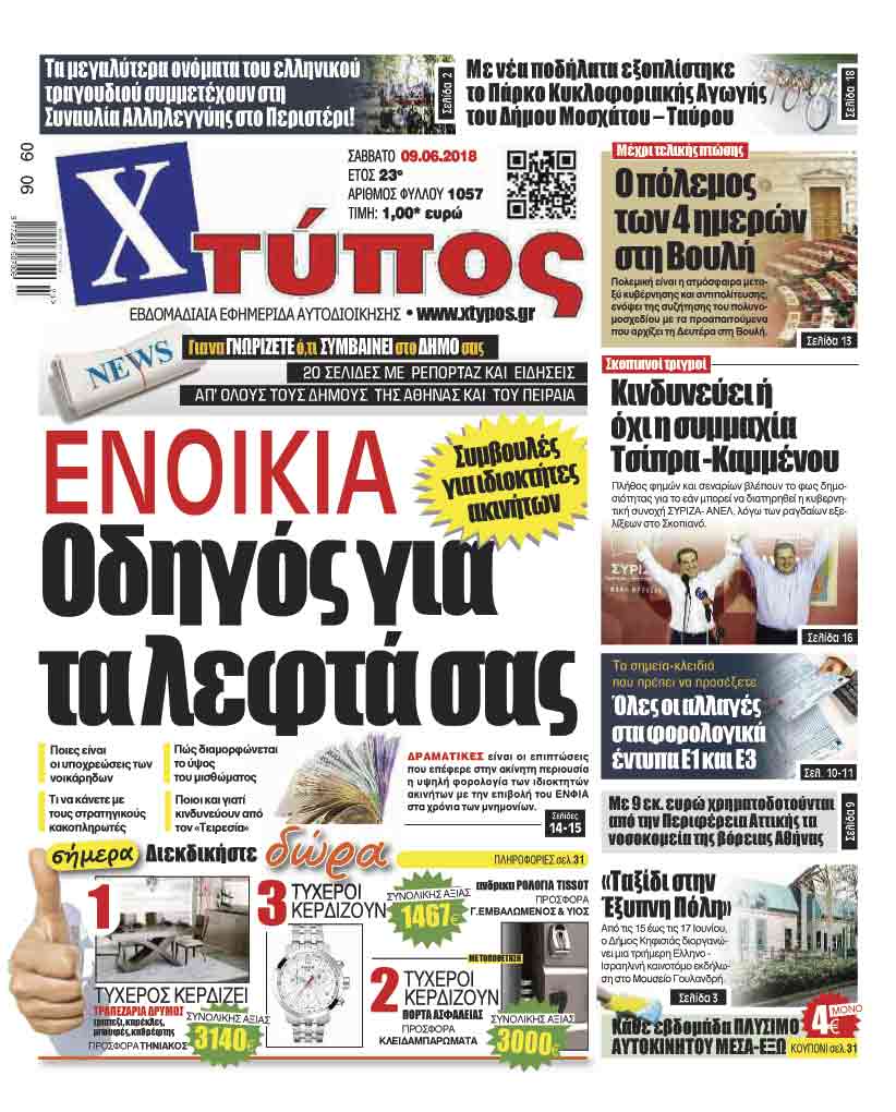 Πρωτοσέλιδο «ΧΤΥΠΟΣ» Σαββάτου 9 Ιουνίου 2018