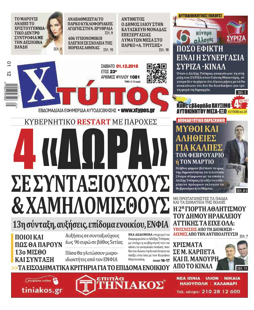 Πρωτοσέλιδο «ΧΤΥΠΟΣ» Σάββατο 1 Δεκεμβρίου 2018