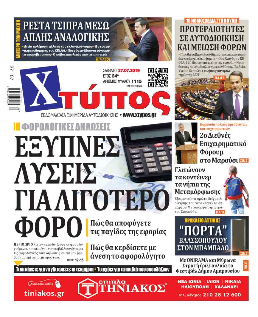 Πρωτοσέλιδο «ΧΤΥΠΟΣ» Σάββατο 27 Ιουλίου 2019