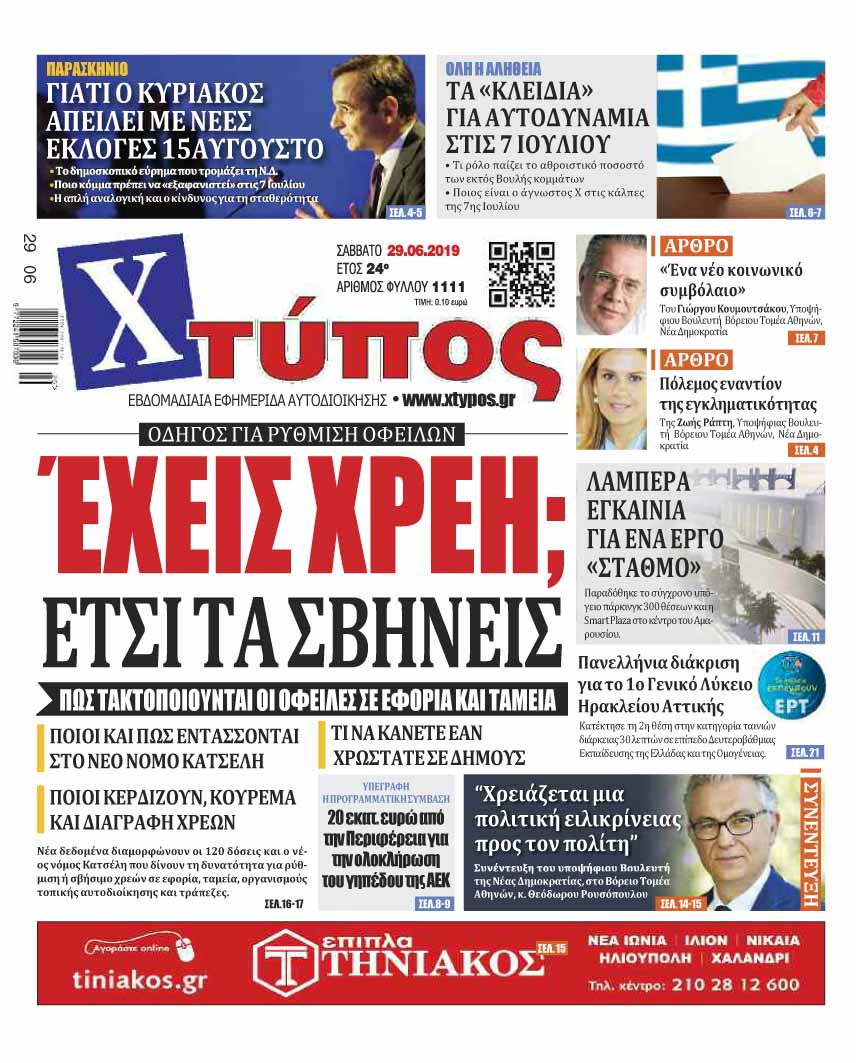 Πρωτοσέλιδο «ΧΤΥΠΟΣ» Σάββατο 29 Ιουνίου 2019