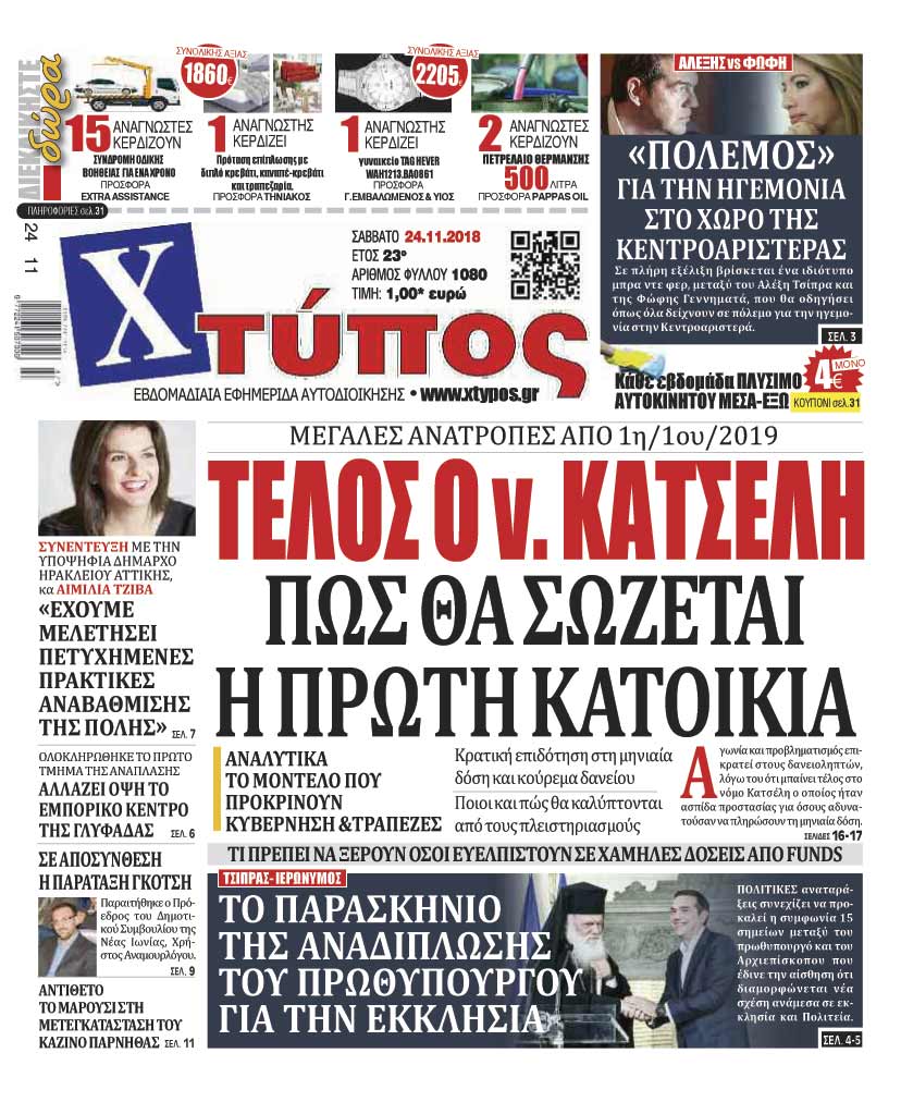 Πρωτοσέλιδο «ΧΤΥΠΟΣ» Σάββατο 24 Νοεμβρίου 2018