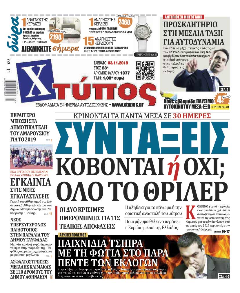 Πρωτοσέλιδο «ΧΤΥΠΟΣ» Σάββατο 3 Νοεμβρίου 2018