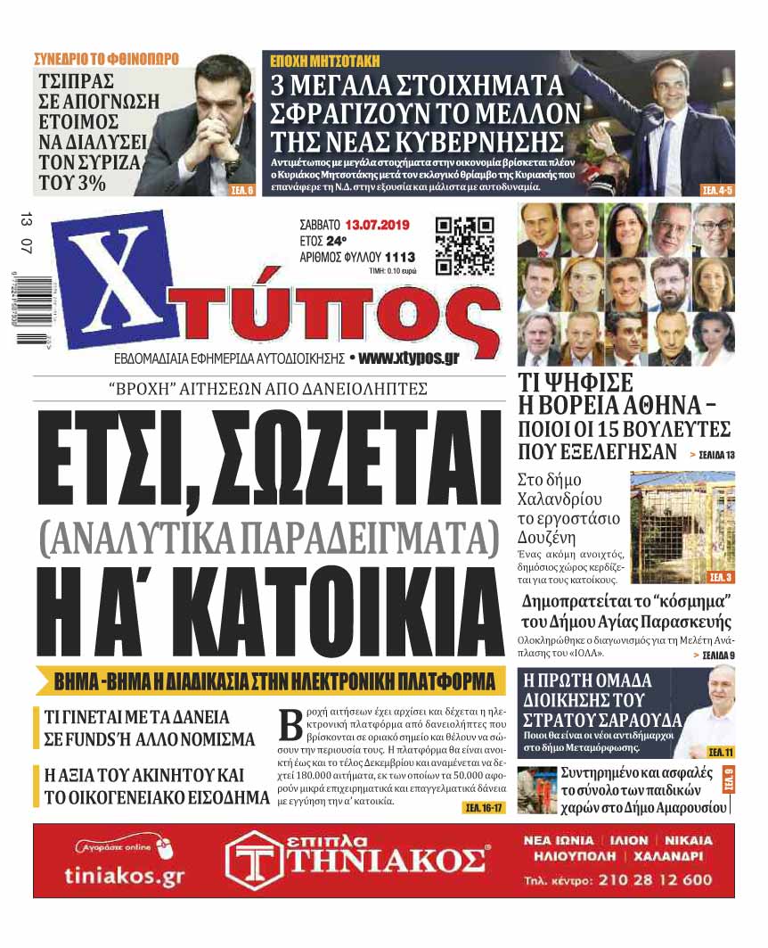 Πρωτοσέλιδο «ΧΤΥΠΟΣ» Σάββατο 13 Ιουλίου 2019