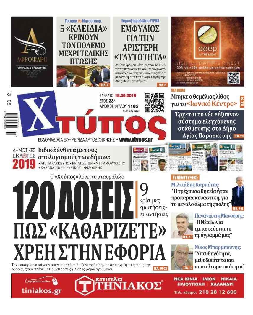Πρωτοσέλιδο «ΧΤΥΠΟΣ» Σάββατο 18 Μαΐου 2019