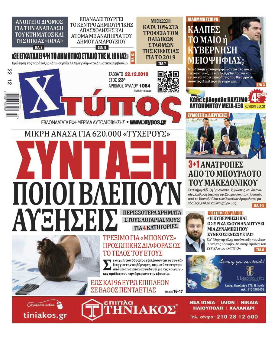 Πρωτοσέλιδο «ΧΤΥΠΟΣ» Σάββατο 22 Δεκεμβρίου 2018