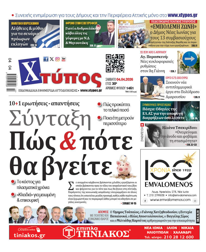 “Πρωτοσέλιδο της εφημερίδας «ΧΤΥΠΟΣ» Σάββατο 4 Απριλίου 2026” Δημοσιεύθηκε πριν από: 15 λεπτά 3 Απριλίου 2026 169 Κοινοποίηση FacebookTwitterPinterestTelegramWhatsAppViberΤυπώνωΗΛΕΚΤΡΟΝΙΚΗ ΔΙΕΥΘΥΝΣΗCopy URL Αποθήκευση δημοσίευσηςΑποθηκεύθηκε Κατεβάστε το ηλεκτρονικό φύλλο Ηλεκτρονική έκδοση εφημερίδας Χτύπος, Φύλλο 1461, 4/4/2026 ΠΡΟΣΦΑΤΑ ΠΡΩΤΟΣΕΛΙΔΑ “Πρωτοσέλιδο της εφημερίδας «ΧΤΥΠΟΣ» Σάββατο 28 Μαρτίου 2026” “Πρωτοσέλιδο της εφημερίδας «ΧΤΥΠΟΣ» Σάββατο 21 Μαρτίου 2026” “Πρωτοσέλιδο της εφημερίδας «ΧΤΥΠΟΣ» Σάββατο 14 Μαρτίου 2026” “Πρωτοσέλιδο της εφημερίδας «ΧΤΥΠΟΣ» Σάββατο 7 Μαρτίου 2026” “Πρωτοσέλιδο της εφημερίδας «ΧΤΥΠΟΣ» Σάββατο 28 Φεβρουαρίου 2026” Φόρτωση περισσοτέρων Προηγούμενο άρθρο“Πρωτοσέλιδο της εφημερίδας «ΧΤΥΠΟΣ» Σάββατο 28 Μαρτίου 2026” ΠΡΟΣΦΑΤΑ ΑΡΘΡΑ Ειδήσεις Γιάννης Χατζηθεοδοσίου: «Πληθωριστικές πιέσεις και γεωπολιτικές προκλήσεις» – Άρθρο στην εφημερίδα «Χτύπος» και στο «xtypos.gr» 3 Απριλίου 2026 Παιδεία ΕΠΑΛ 2026: Όλες οι ημερομηνίες για λήξη μαθημάτων, εξετάσεις και αποτελέσματα 3 Απριλίου 2026 Γενικά άρθρα Όμηρος Τσάπαλος: «Κανένας πολίτης μόνος απέναντι στην ενεργειακή κρίση» – Άρθρο στην εφημερίδα «Χτύπος» και στο «xtypos.gr» 3 Απριλίου 2026 Παιδεία Μόνιμοι διορισμοί εκπαιδευτικών 2026: Εντοπιότητα και πέναλτι άρνησης Νέας Φιλαδέλφειας - Χαλκηδόνας Ευτυχία Παπαλουκά: «Τα σχολεία μας στο επίκεντρο: πράξεις ευθύνης για το μέλλον της πόλης» – Άρθρο στην εφημερίδα «Χτύπος» και στο «xtypos.gr» Γενικά άρθρα Μιλιτιάδης Καρπέτας: «ΚΑΚΟΗΘΕΙΣ ΝΕΟΠΛΑΣΙΕΣ» – Άρθρο στην εφημερίδα «Χτύπος» και στο «xtypos.gr» Οικονομία Market Pass 2026: Νωρίτερα αιτήσεις και αναδρομικά έως 1.200 ευρώ