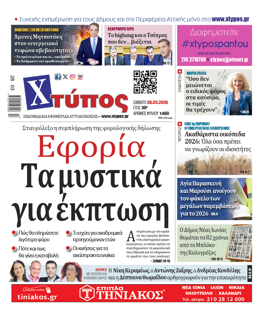 “Πρωτοσέλιδο της εφημερίδας «ΧΤΥΠΟΣ» Σάββατο 28 Μαρτίου 2026” Δημοσιεύθηκε πριν από: 19 λεπτά 27 Μαρτίου 2026 133 Κοινοποίηση FacebookTwitterPinterestTelegramWhatsAppViberΤυπώνωΗΛΕΚΤΡΟΝΙΚΗ ΔΙΕΥΘΥΝΣΗCopy URL Αποθήκευση δημοσίευσηςΑποθηκεύθηκε Κατεβάστε το ηλεκτρονικό φύλλο Ηλεκτρονική έκδοση εφημερίδας Χτύπος, Φύλλο 1460, 28/3/2026 ΠΡΟΣΦΑΤΑ ΠΡΩΤΟΣΕΛΙΔΑ “Πρωτοσέλιδο της εφημερίδας «ΧΤΥΠΟΣ» Σάββατο 21 Μαρτίου 2026” “Πρωτοσέλιδο της εφημερίδας «ΧΤΥΠΟΣ» Σάββατο 14 Μαρτίου 2026” “Πρωτοσέλιδο της εφημερίδας «ΧΤΥΠΟΣ» Σάββατο 7 Μαρτίου 2026” “Πρωτοσέλιδο της εφημερίδας «ΧΤΥΠΟΣ» Σάββατο 28 Φεβρουαρίου 2026” “Πρωτοσέλιδο της εφημερίδας «ΧΤΥΠΟΣ» Σάββατο 21 Φεβρουαρίου 2026” Φόρτωση περισσοτέρων Προηγούμενο άρθρο“Πρωτοσέλιδο της εφημερίδας «ΧΤΥΠΟΣ» Σάββατο 21 Μαρτίου 2026” ΠΡΟΣΦΑΤΑ ΑΡΘΡΑ Εργασία Πανελλήνιες 2026: Λήγουν οι αιτήσεις για Αστυνομικές Σχολές στις 29 Μαρτίου 27 Μαρτίου 2026 Κηφισιάς - Νέας Ερυθραίας - Εκάλης Πάρκο Παπανδρέου: Δωρεάν εξετάσεις και δράσεις για όλους στο Φεστιβάλ Υγείας & Δημιουργικότητας την 1η Απριλίου 27 Μαρτίου 2026 Παλαιού Φαλήρου Απαλλοτριώσεις για το έργο στο ρέμα Πικροδάφνης – Τι καλούνται να κάνουν οι ιδιοκτήτες 27 Μαρτίου 2026 Παλλήνης Από 1η Απριλίου οι καθαρισμοί οικοπέδων στην Παλλήνη – Υποχρεωτική η δήλωση μέσω πλατφόρμας Γενικά άρθρα Κηφισιά: Κατανυκτική συναυλία «Ω Γλυκύ μου Έαρ» τη Μεγάλη Δευτέρα με ελεύθερη είσοδο Λαυρεωτικής Συνεχίζεται η δημοτική γραμμή για μαθητές Π.ΕΠΑ.Λ. Λαυρίου – Σε λειτουργία από 27/03 Οικονομία Fuel Pass 2026: Σε ΦΕΚ η απόφαση – Πότε ανοίγουν οι αιτήσεις στο Gov